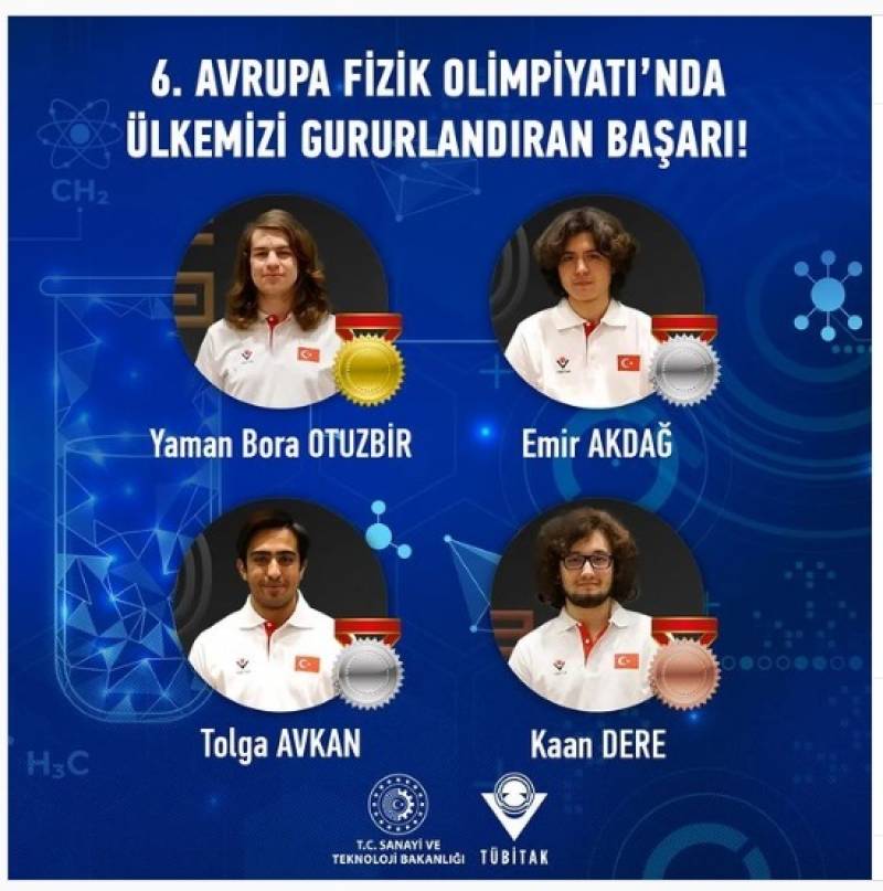 6. Avrupa Fizik Olimpiyatı'nda, Ülkemize Madalyalar Kazandıran Gençlerimizi (Yaman Bora Otuzbir, Emir Akdağ, Tolga Avkan ve Kaan Dere) tebrik ediyor başarılarının devamını diliyoruz. Bu gurur tablosunun oluşmasında katkıları büyük olan bölümümüz öğretim üyesi ve TÜBİTAK Fen Lisesi Müdürü Sayın Dr. Öğr. Üyesi Hacı Ahmet Yıldırım hocamızı ve tüm çalışma ekibini canı gönülden tebrik ediyoruz. Sizinle gurur duyuyoruz...