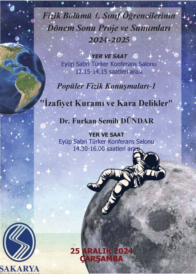 Sunumların ardından Fizik Bölümü Popüler Fizik Konuşmaları kapsamında Dr. Öğretim Üyesi Furkan Semih DÜNDAR'ın "İzafiyet Kuramı ve Kara Delikler" başlıklı konuşmaları saat 14.30'da başlayacaktır.