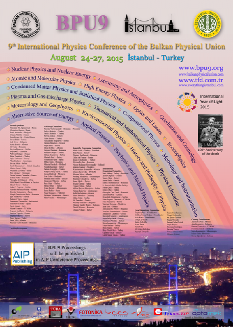 24 - 27 Ağustos 2015 tarihleri arasında İstanbul İstanbul Üniversitesi Fen Fakültesi Cemil Bilsel Konferans Salonu'nda Balkan Fizik Birliği 9. Uluslararası Fizik Konferansı düzenlenecektir.