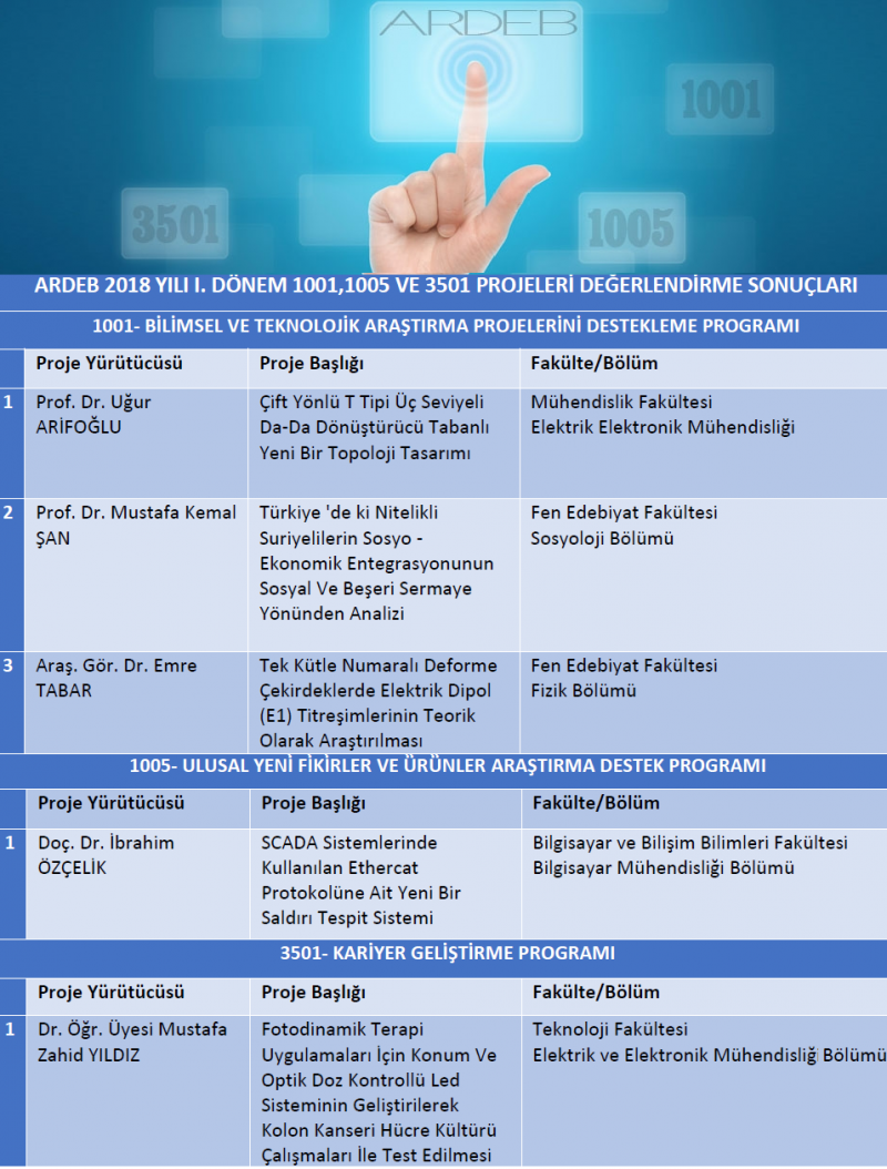 Öğretim elemanlarımızdan Arş. Gör. Dr. Emre TABAR tarafından 2018 yılı 1. dönemde Araştırma Destek Programları Başkanlığına (ARDEB) önerilen 1001 projesi TÜBİTAK tarafından destek almaya hak kazanmıştır. Arş. Gör. Dr. Emre TABAR ve proje ekibini tebrik eder başarılarının devamın dileriz.